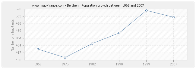 Population of Berthen was 501 inhabitants in 2007, 517 inhabitants in 1999, 464 inhabitants in 1990, 439 inhabitants in 1982, 406 inhabitants in 1975 and 426 inhabitants in 1968.