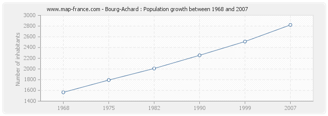Population of Bourg-Achard was 2 822 inhabitants in 2007, 2 512 inhabitants in 1999, 2 255 inhabitants in 1990, 2 009 inhabitants in 1982, 1 793 inhabitants in 1975 and 1 564 inhabitants in 1968.