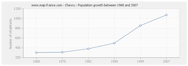 Population of Chevru was 1 073 inhabitants in 2007, 856 inhabitants in 1999, 496 inhabitants in 1990, 380 inhabitants in 1982, 309 inhabitants in 1975 and 302 inhabitants in 1968.