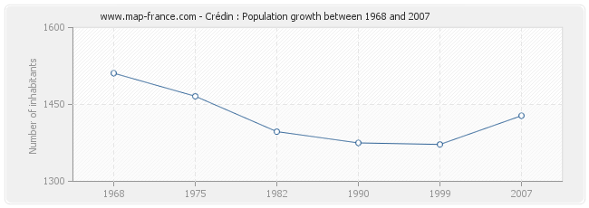 Population of Crédin was 1 428 inhabitants in 2007, 1 372 inhabitants in 1999, 1 375 inhabitants in 1990, 1 397 inhabitants in 1982, 1 466 inhabitants in 1975 and 1 511 inhabitants in 1968.