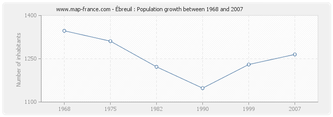 Population of Ébreuil was 1 265 inhabitants in 2007, 1 230 inhabitants in 1999, 1 148 inhabitants in 1990, 1 222 inhabitants in 1982, 1 311 inhabitants in 1975 and 1 347 inhabitants in 1968.