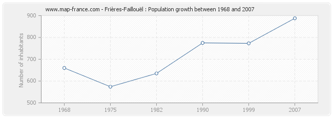 Population of Frières-Faillouël was 888 inhabitants in 2007, 773 inhabitants in 1999, 775 inhabitants in 1990, 635 inhabitants in 1982, 574 inhabitants in 1975 and 660 inhabitants in 1968.