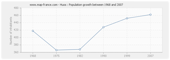 Population of Huos was 462 inhabitants in 2007, 452 inhabitants in 1999, 428 inhabitants in 1990, 368 inhabitants in 1982, 366 inhabitants in 1975 and 418 inhabitants in 1968.
