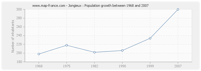 Population of Jongieux was 300 inhabitants in 2007, 234 inhabitants in 1999, 206 inhabitants in 1990, 202 inhabitants in 1982, 218 inhabitants in 1975 and 198 inhabitants in 1968.
