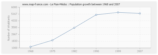 Population of Le Pian-Médoc was 5 248 inhabitants in 2007, 5 375 inhabitants in 1999, 5 078 inhabitants in 1990, 3 481 inhabitants in 1982, 1 948 inhabitants in 1975 and 1 144 inhabitants in 1968.
