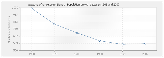 Population of Lignac was 581 inhabitants in 2007, 572 inhabitants in 1999, 614 inhabitants in 1990, 706 inhabitants in 1982, 809 inhabitants in 1975 and 992 inhabitants in 1968.