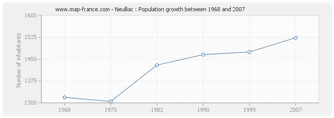 Population of Neulliac was 1 524 inhabitants in 2007, 1 475 inhabitants in 1999, 1 466 inhabitants in 1990, 1 430 inhabitants in 1982, 1 305 inhabitants in 1975 and 1 319 inhabitants in 1968.