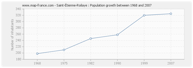 Population of Saint-Étienne-Roilaye was 325 inhabitants in 2007, 320 inhabitants in 1999, 258 inhabitants in 1990, 246 inhabitants in 1982, 210 inhabitants in 1975 and 198 inhabitants in 1968.