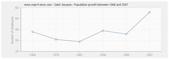 Population of Saint-Jacques was 56 inhabitants in 2007, 36 inhabitants in 1999, 39 inhabitants in 1990, 29 inhabitants in 1982, 31 inhabitants in 1975 and 38 inhabitants in 1968.