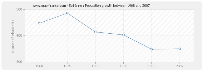 Population of Solférino was 350 inhabitants in 2007, 348 inhabitants in 1999, 403 inhabitants in 1990, 414 inhabitants in 1982, 486 inhabitants in 1975 and 447 inhabitants in 1968.