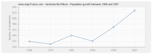 Population of Varennes-lès-Mâcon was 530 inhabitants in 2007, 480 inhabitants in 1999, 438 inhabitants in 1990, 455 inhabitants in 1982, 429 inhabitants in 1975 and 437 inhabitants in 1968.