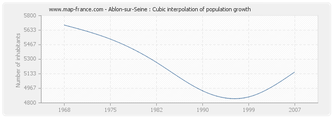 This curve shows the history of the population of Ablon-sur-Seine from 1968 to 2007 in cubic interpolation. This provides more precisely the population of the municipality of Ablon-sur-Seine the years where no census has been taken.