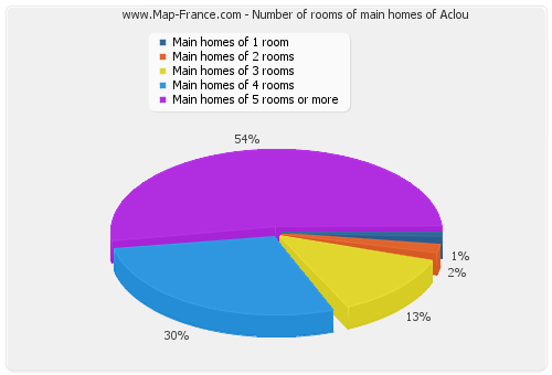 - Number of main homes of Aclou of 1 room : 1 - Number of main homes of Aclou of 2 rooms : 2 - Number of main homes of Aclou of 3 rooms : 14 - Number of main homes of Aclou of 4 rooms : 14 - Number of main homes of Aclou of 5 rooms and more : 57 |