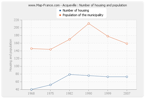 The population of Acqueville was 159 inhabitants in 2007, 178 inhabitants in 1999, 211 inhabitants in 1990, 170 inhabitants in 1982, 144 inhabitants in 1975 and 146 inhabitants in 1968. Meanwhile, the number of housing of Acqueville was 73 in 2007, 73 in 1999, 76 in 1990, 79 in 1982, 52 in 1975 and 40 in 1968.