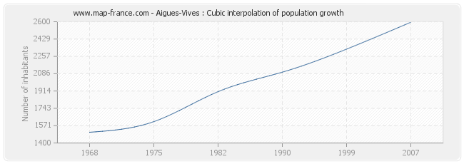 This curve shows the history of the population of Aigues-Vives from 1968 to 2007 in cubic interpolation. This provides more precisely the population of the municipality of Aigues-Vives the years where no census has been taken.