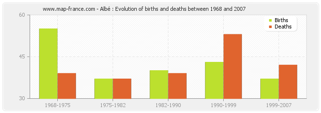 Albé : evolution of births and deaths from 1968 to 2007