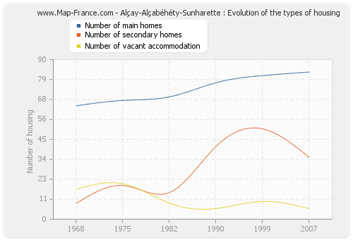 The following graphs show the history of the number and the type of housing of Alçay-Alçabéhéty-Sunharette from 1968 to 2007. The second graph is drawn in cubic interpolation. This allows to obtain more exactly the number of accommodation of the town of Alçay-Alçabéhéty-Sunharette years where no inventory was made.