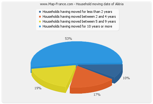 - Number of households of Aléria having moved between 2 and 5 years : 126 - Number of households of Aléria having moved between 5 and 9 years : 139 - Number of households of Aléria having moved for 10 years or more : 389 |