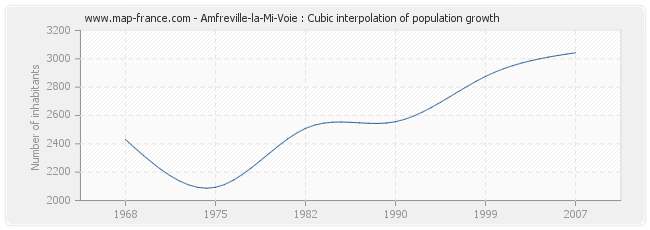 This curve shows the history of the population of Amfreville-la-Mi-Voie from 1968 to 2007 in cubic interpolation. This provides more precisely the population of the municipality of Amfreville-la-Mi-Voie the years where no census has been taken.