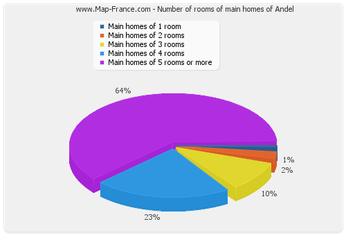 - Number of main homes of Andel of 1 room : 2 - Number of main homes of Andel of 2 rooms : 9 - Number of main homes of Andel of 3 rooms : 38 - Number of main homes of Andel of 4 rooms : 38 - Number of main homes of Andel of 5 rooms and more : 245 |