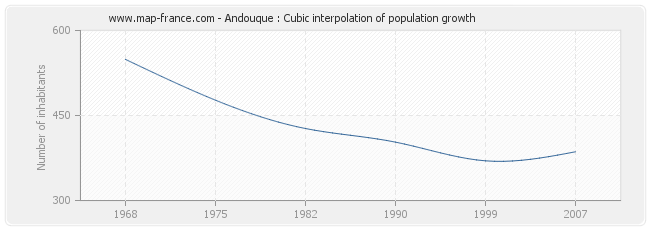 This curve shows the history of the population of Andouque from 1968 to 2007 in cubic interpolation. This provides more precisely the population of the municipality of Andouque the years where no census has been taken.