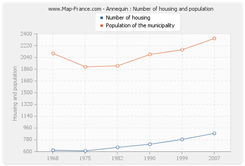 The population of Annequin was 2 331 inhabitants in 2007, 2 158 inhabitants in 1999, 2 086 inhabitants in 1990, 1 912 inhabitants in 1982, 1 897 inhabitants in 1975 and 2 101 inhabitants in 1968. Meanwhile, the number of housing of Annequin was 879 in 2007, 786 in 1999, 712 in 1990, 665 in 1982, 611 in 1975 and 621 in 1968.