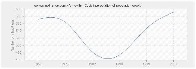This curve shows the history of the population of Annoville from 1968 to 2007 in cubic interpolation. This provides more precisely the population of the municipality of Annoville the years where no census has been taken.
