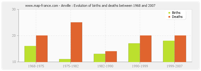 Population of Anville was 191 inhabitants in 2007, 156 inhabitants in 1999, 173 inhabitants in 1990, 169 inhabitants in 1982, 181 inhabitants in 1975 and 217 inhabitants in 1968.