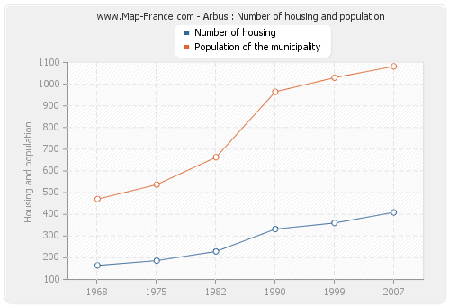 The population of Arbus was 1 082 inhabitants in 2007, 1 030 inhabitants in 1999, 965 inhabitants in 1990, 663 inhabitants in 1982, 537 inhabitants in 1975 and 470 inhabitants in 1968. Meanwhile, the number of housing of Arbus was 409 in 2007, 360 in 1999, 332 in 1990, 229 in 1982, 187 in 1975 and 165 in 1968.