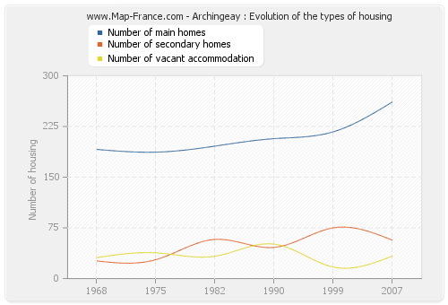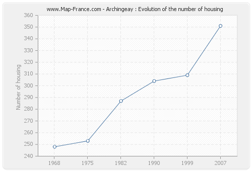 The number of housing of Archingeay was 351 in 2007, 309 in 1999, 304 in 1990, 287 in 1982, 253 in 1975 and 248 in 1968.