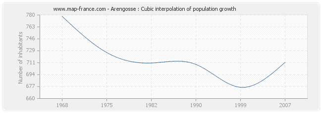 This curve shows the history of the population of Arengosse from 1968 to 2007 in cubic interpolation. This provides more precisely the population of the municipality of Arengosse the years where no census has been taken.