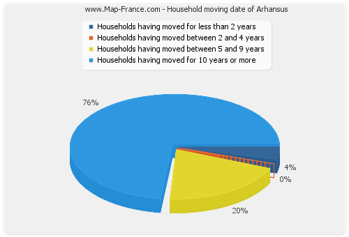 - Number of households of Arhansus having moved between 2 and 5 years : 0 - Number of households of Arhansus having moved between 5 and 9 years : 5 - Number of households of Arhansus having moved for 10 years or more : 19 |