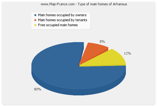 - Number of main homes of Arhansus occupied by owners : 20 - Number of main homes of Arhansus occupied by tenants : 2 - Number of main homes of Arhansus occupied free of charge : 3 |