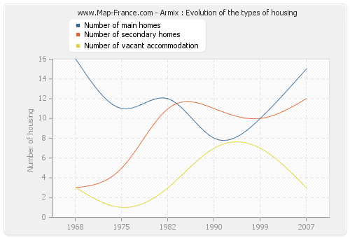 The following graphs show the history of the number and the type of housing of Armix from 1968 to 2007. The second graph is drawn in cubic interpolation. This allows to obtain more exactly the number of accommodation of the town of Armix years where no inventory was made.