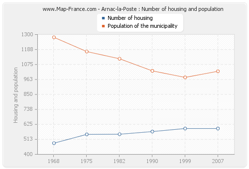 The population of Arnac-la-Poste was 1 024 inhabitants in 2007, 978 inhabitants in 1999, 1 027 inhabitants in 1990, 1 118 inhabitants in 1982, 1 172 inhabitants in 1975 and 1 279 inhabitants in 1968. Meanwhile, the number of housing of Arnac-la-Poste was 594 in 2007, 594 in 1999, 571 in 1990, 551 in 1982, 550 in 1975 and 484 in 1968.