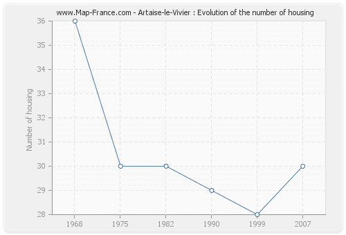 The number of housing of Artaise-le-Vivier was 30 in 2007, 28 in 1999, 29 in 1990, 30 in 1982, 30 in 1975 and 36 in 1968.