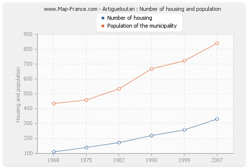 The population of Artigueloutan was 840 inhabitants in 2007, 722 inhabitants in 1999, 669 inhabitants in 1990, 534 inhabitants in 1982, 459 inhabitants in 1975 and 435 inhabitants in 1968. Meanwhile, the number of housing of Artigueloutan was 331 in 2007, 258 in 1999, 220 in 1990, 173 in 1982, 140 in 1975 and 111 in 1968.