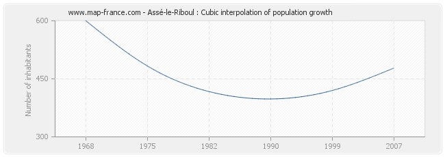 This curve shows the history of the population of Assé-le-Riboul from 1968 to 2007 in cubic interpolation. This provides more precisely the population of the municipality of Assé-le-Riboul the years where no census has been taken.