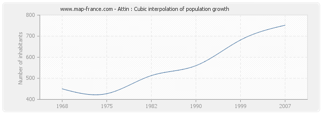 This curve shows the history of the population of Attin from 1968 to 2007 in cubic interpolation. This provides more precisely the population of the municipality of Attin the years where no census has been taken.
