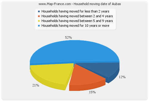 - Number of households of Aubas having moved between 2 and 5 years : 37 - Number of households of Aubas having moved between 5 and 9 years : 51 - Number of households of Aubas having moved for 10 years or more : 129 |