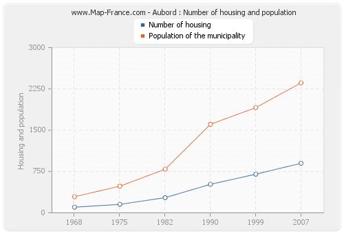The population of Aubord was 2 360 inhabitants in 2007, 1 910 inhabitants in 1999, 1 607 inhabitants in 1990, 791 inhabitants in 1982, 483 inhabitants in 1975 and 292 inhabitants in 1968. Meanwhile, the number of housing of Aubord was 899 in 2007, 701 in 1999, 517 in 1990, 275 in 1982, 153 in 1975 and 102 in 1968.