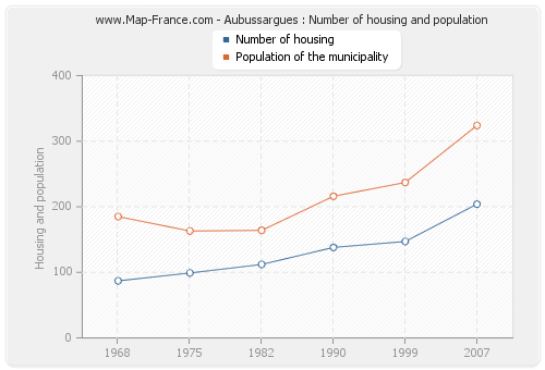 The population of Aubussargues was 324 inhabitants in 2007, 237 inhabitants in 1999, 216 inhabitants in 1990, 164 inhabitants in 1982, 163 inhabitants in 1975 and 185 inhabitants in 1968. Meanwhile, the number of housing of Aubussargues was 204 in 2007, 147 in 1999, 138 in 1990, 112 in 1982, 99 in 1975 and 87 in 1968.
