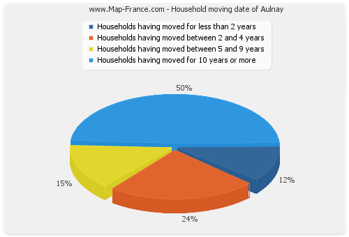- Number of households of Aulnay having moved between 2 and 5 years : 173 - Number of households of Aulnay having moved between 5 and 9 years : 104 - Number of households of Aulnay having moved for 10 years or more : 354 |