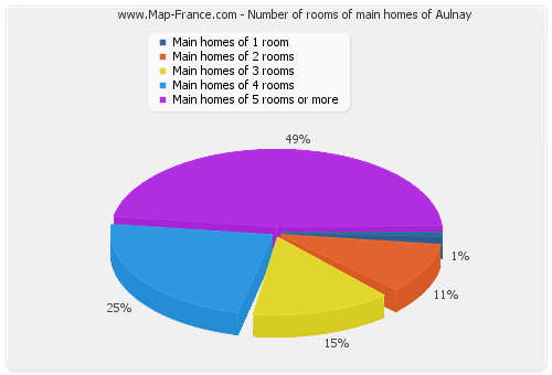 - Number of main homes of Aulnay of 1 room : 7 - Number of main homes of Aulnay of 2 rooms : 76 - Number of main homes of Aulnay of 3 rooms : 104 - Number of main homes of Aulnay of 4 rooms : 104 - Number of main homes of Aulnay of 5 rooms and more : 351 |