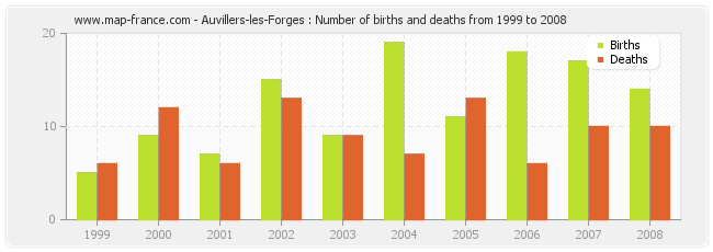 Auvillers-les-Forges : births and deaths from 1999 to 2008