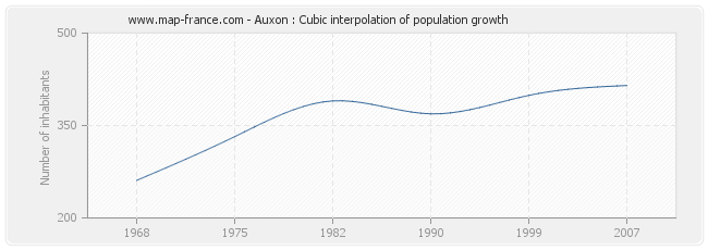 This curve shows the history of the population of Auxon from 1968 to 2007 in cubic interpolation. This provides more precisely the population of the municipality of Auxon the years where no census has been taken.