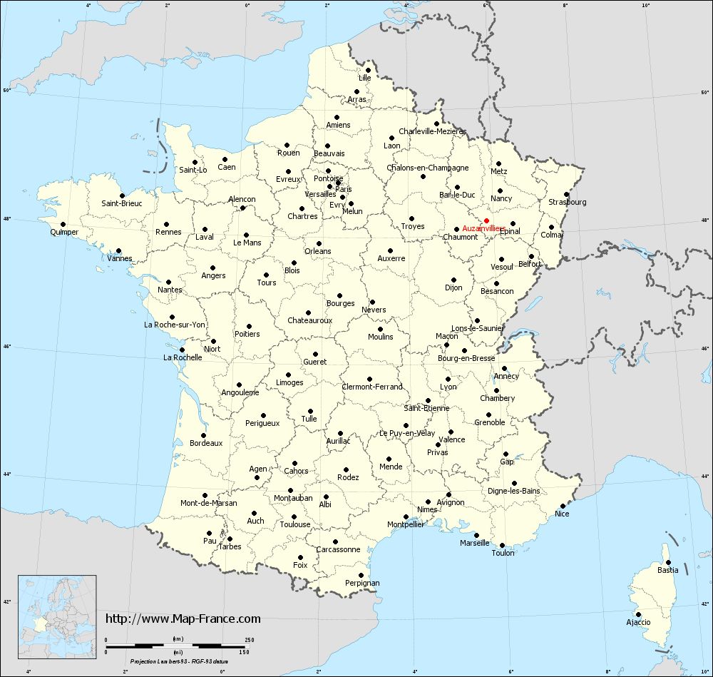 You will find the location of Auzainvilliers on the map of France of regions in Lambert 93 coordinates. The town of Auzainvilliers is located in the department of Vosges of the french region Lorraine.