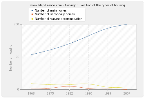 The number of housing of Awoingt was 208 in 2007, 197 in 1999, 185 in 1990, 166 in 1982, 141 in 1975 and 127 in 1968.