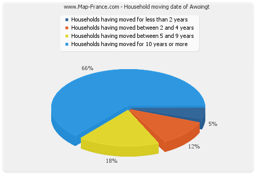 - Number of households of Awoingt having moved between 2 and 5 years : 23 - Number of households of Awoingt having moved between 5 and 9 years : 36 - Number of households of Awoingt having moved for 10 years or more : 131 |