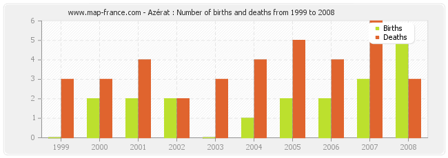 Population of Azérat was 265 inhabitants in 2007, 274 inhabitants in 1999, 285 inhabitants in 1990, 240 inhabitants in 1982, 234 inhabitants in 1975 and 252 inhabitants in 1968.